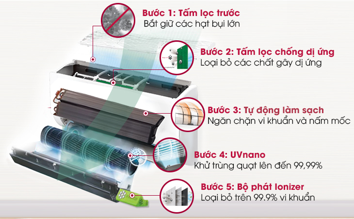 Máy giải phóng hàng triệu ion dương và âm để bao vây, tiêu diệt vi khuẩn và các tác nhân gây dị ứng. Điều này mang lại không gian sạch sẽ, thơm tho.